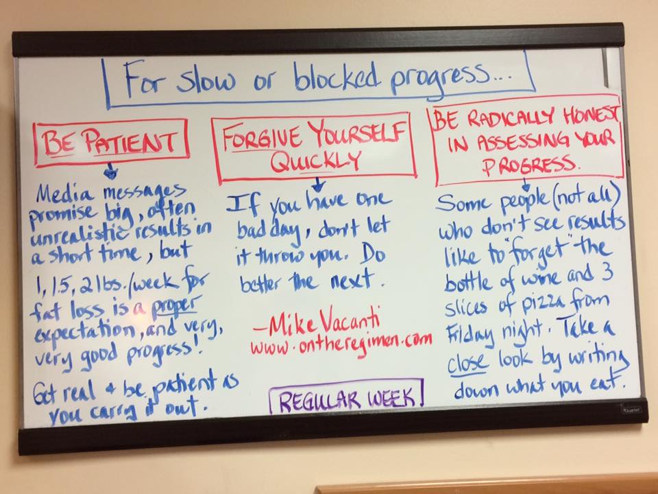 Yesterday, after a massage, reassurance, & support from my PT, my leg & heart felt so much better. Today, after emptying the dishwasher, feeding the kids, & collecting some laundry, my upper hams are hurting & tight again, and my heart a little defeated. I had to lay down instead of starting the wash. But. I know this path a little better now. And it looks a little like the road my clients take to get fit and lose weight. Looking back at my white board with Mike’s words here is helping me to go easy.