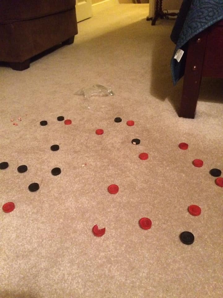 Well. That’s one way to clean out what’s under the bed. Puppies play checkers.